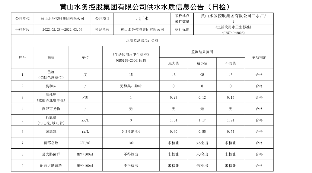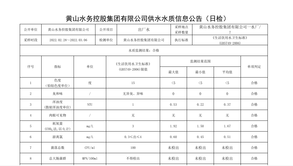 黃山水務(wù)控股集團有限公司供水水質(zhì)信息公告【日檢,(2022.02.28_2022.03.06)】