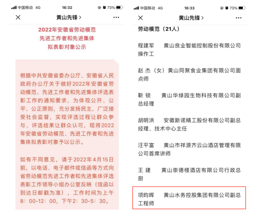 2022年4月11日,根據(jù)《中共安徽省委辦公廳、安徽省人民政府辦公廳關(guān)于做好2022年安徽省勞動模范、先進工作者和先進集體評選表彰工作的通知》要求,市總工會經(jīng)過預選、函評、會評,確定擬認了29個安徽省勞動模范和先進工作者及4個省先進集體。黃山水務(wù)控股集團副總工程師項昀暉獲得2022年安徽省勞動模范、先進工作者和先進集體擬表彰對象。