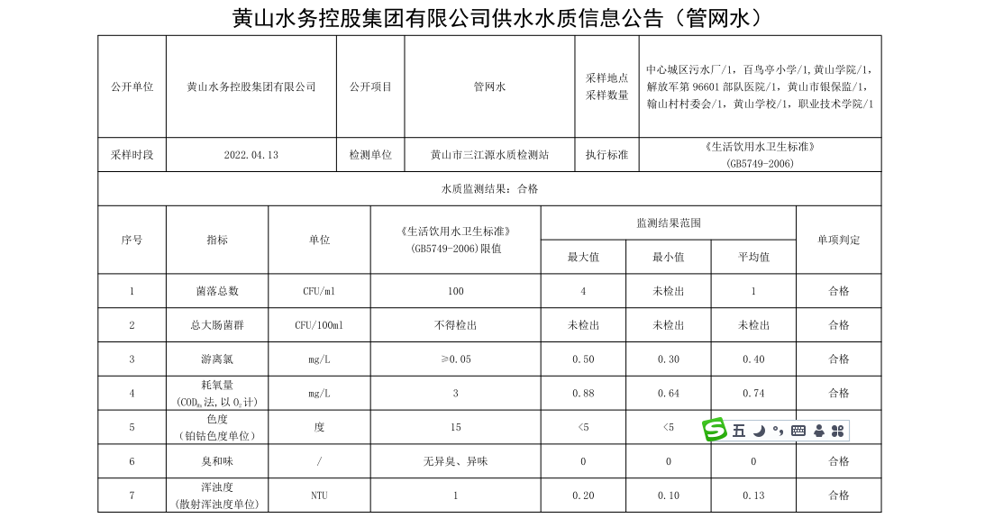 黃山水務(wù)控股集團有限公司供水水質(zhì)信息公告(管網(wǎng)水,2022年04月上)