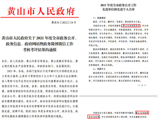 2022年6月13日,黃山市人民政府印發(fā)《黃山市人民政府關(guān)于2021年度全市政務(wù)公開、政務(wù)信息、政府網(wǎng)站暨政務(wù)微博微信工作考核考評(píng)結(jié)果的通報(bào)》,對(duì)在2021年度全市政務(wù)公開中取得優(yōu)異成績(jī)的單位和個(gè)人予以通報(bào)表彰。黃山水務(wù)控股集團(tuán)榮獲“2021年度全市政務(wù)公開工作先進(jìn)單位”稱號(hào),劉東偉同志被評(píng)為“2021年度全市政務(wù)公開工作先進(jìn)個(gè)人”。
