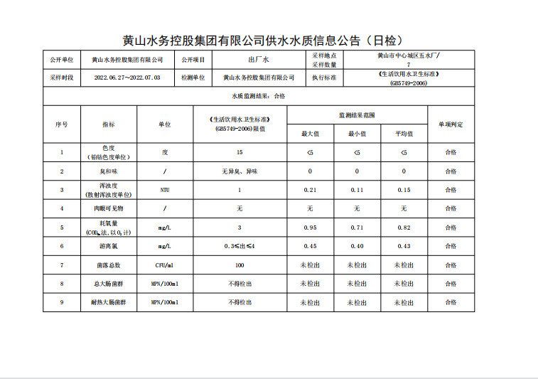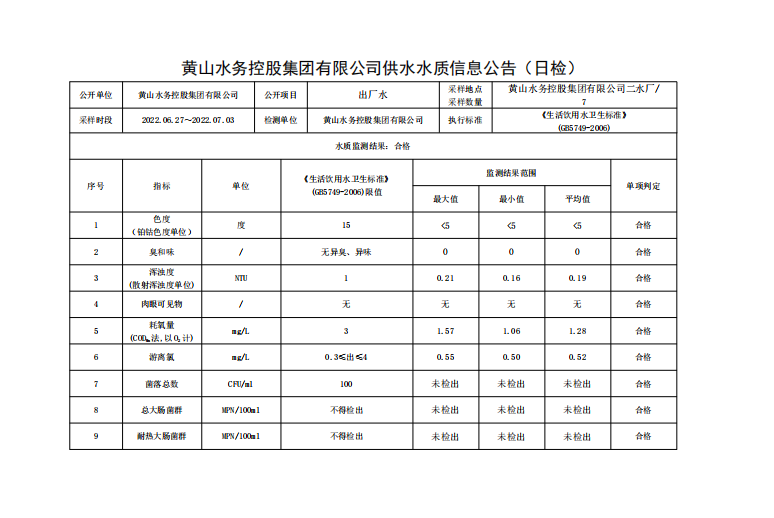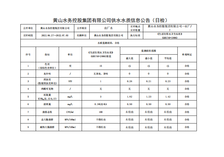 黃山水務(wù)控股集團(tuán)有限公司供水水質(zhì)信息公告【日檢,(2022.06.27_2022.07.03)】