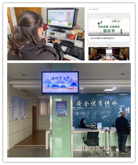 線上祭掃托哀思。鼓勵(lì)全體黨員干部職工積極參加網(wǎng)上祭英烈活動(dòng),通過登錄網(wǎng)上祭英烈平臺(tái),線上為革命英烈敬獻(xiàn)鮮花、發(fā)表感言。同時(shí),充分利用黃山水務(wù)微信公眾號(hào)發(fā)布文明祭掃倡議書,并在客服大廳電子屏滾動(dòng)播放“文明祭祀”等字幕及宣傳圖片,號(hào)召綠色祭奠、環(huán)保祭祀,營造濃厚文明祭祀氛圍。