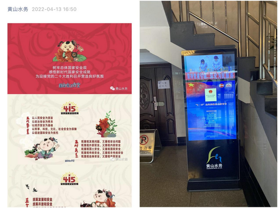 一、做好宣傳教育,營造良好氛圍。水務(wù)控股集團(tuán)充分利用大樓電子屏,運(yùn)用黃山水務(wù)微信公眾號播放發(fā)布安全教育宣傳海報,大力宣傳總體國家安全觀,營造良好的宣傳氛圍。